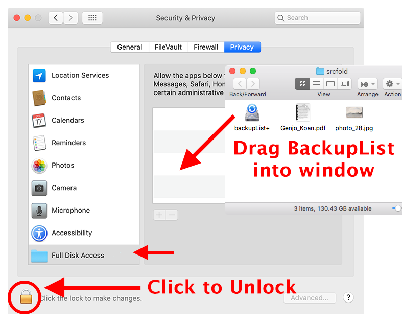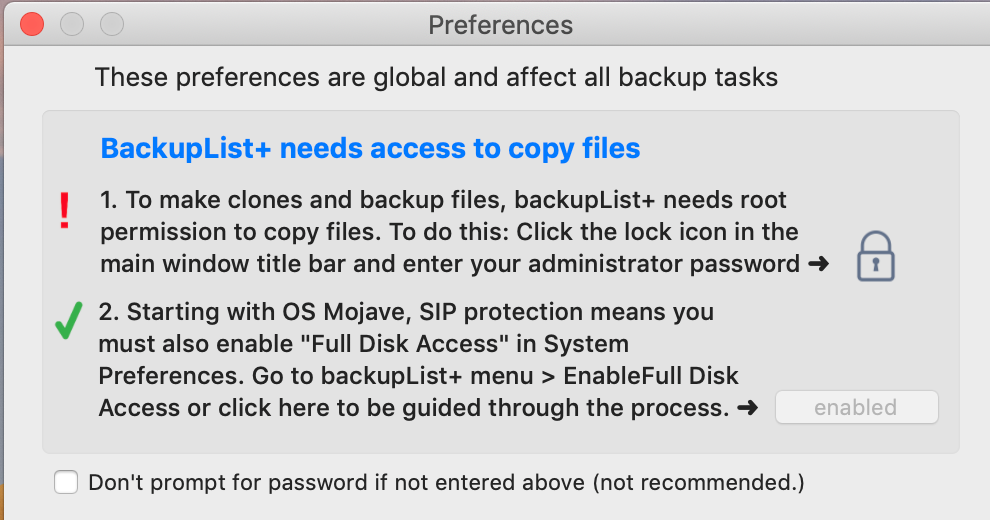 Then follow the instructions there > click the lock in the main backupList+ window and enter your admin password. Then click the "enable" button to open System preferences and follow the instructions in the window.